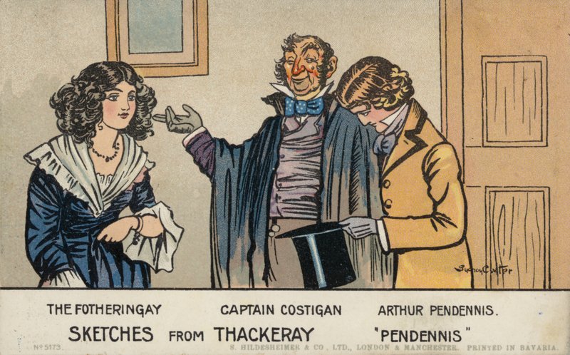 william makepeace thackeray · literature · british · english · character · victorian · 19th century · pendennis · captain costigan · emily fotheringay · arthur pendennis · father · daughter · love · introduction · meeting · Private Collection / Bridgeman Images · / Look and Learn |