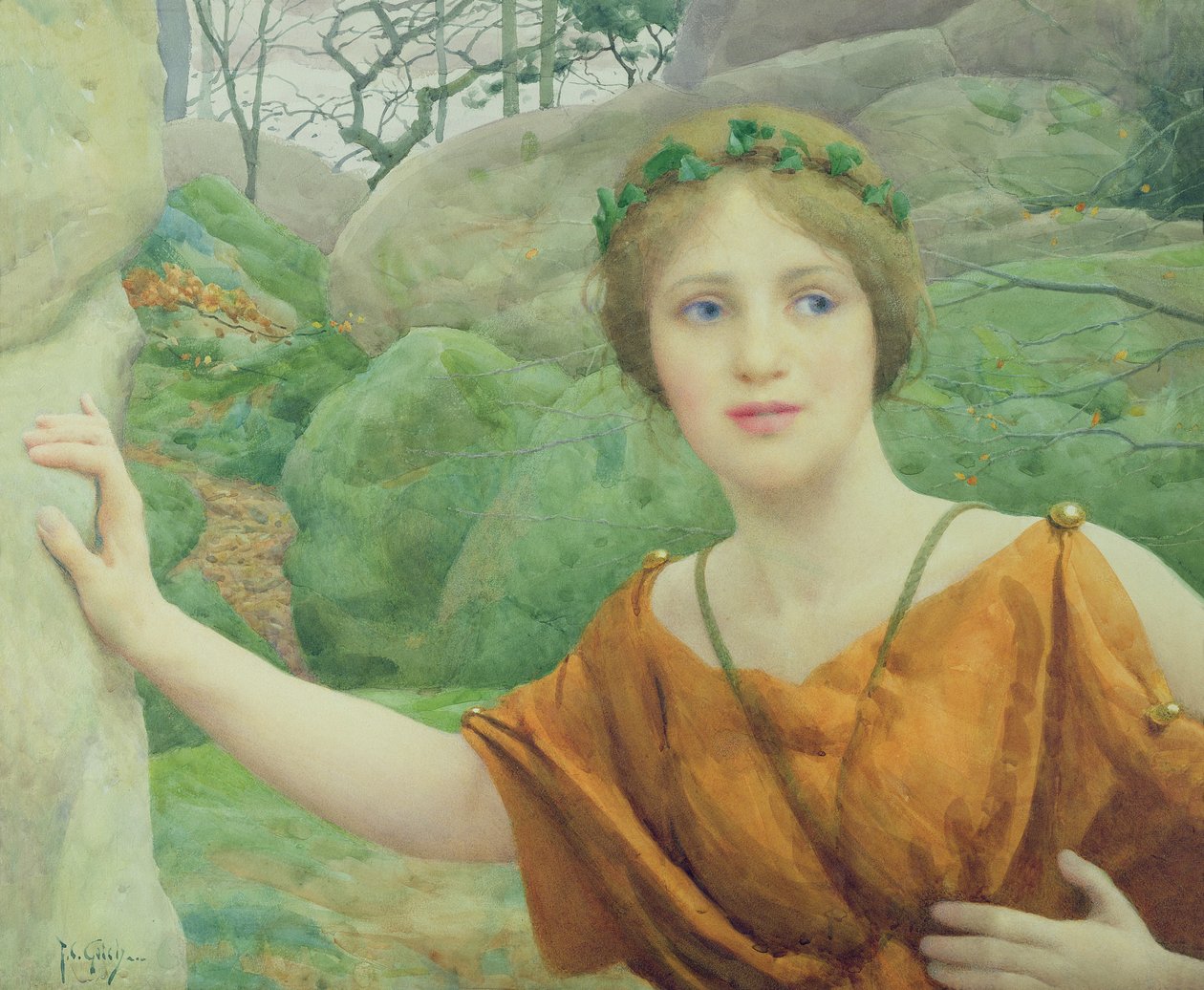 dryad · wood · rocks · winter · symbolist · fairy tale · beauty · carnation · pale · youth · Alfred East Gallery, Kettering Borough Council / Bridgeman Images
