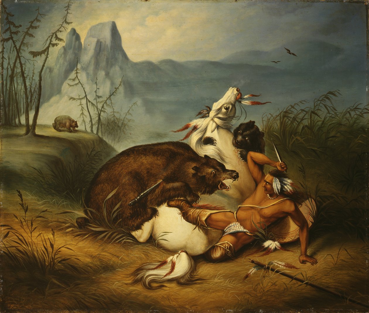 bear · knife · attack · indigenous · horse · white · headdress · mountains · tree · birds |