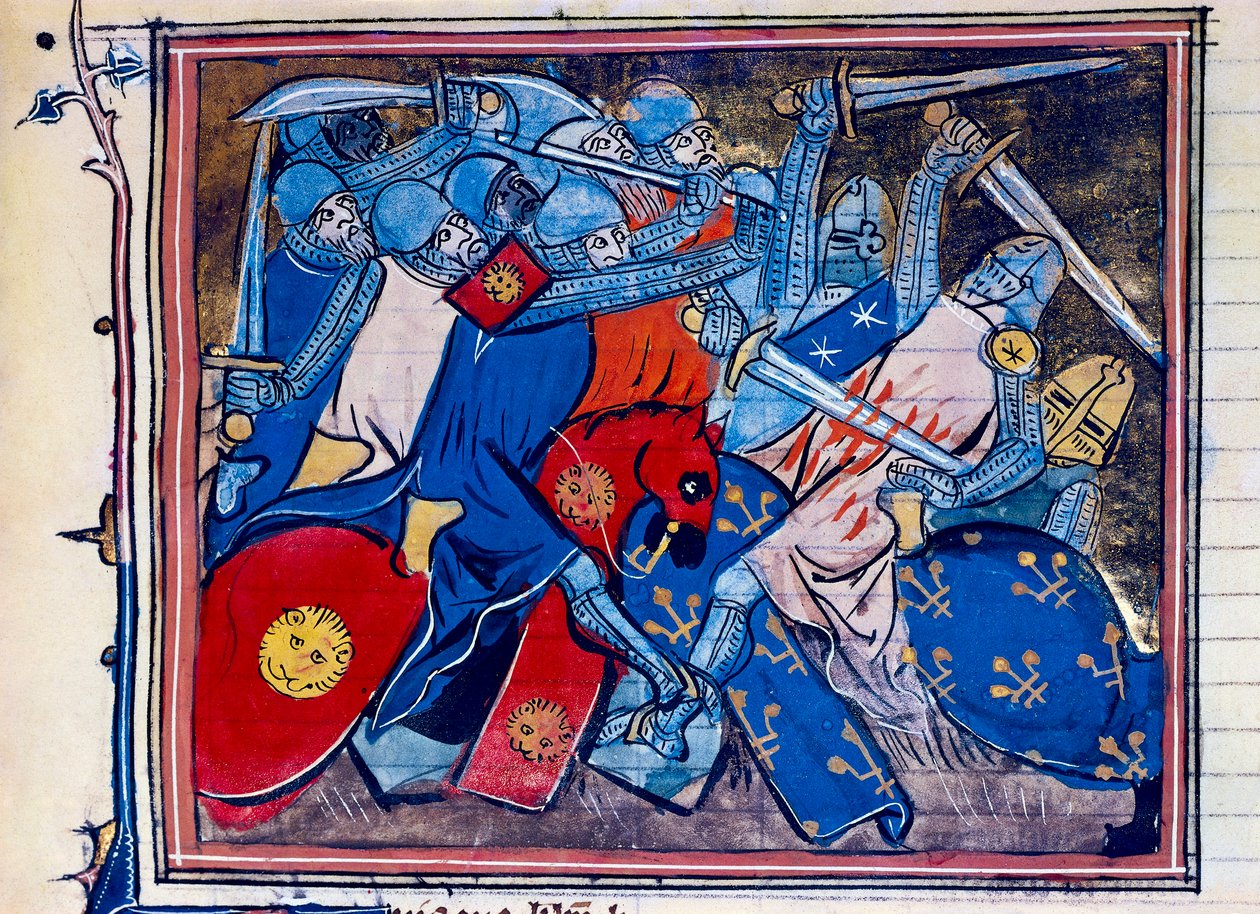 14th century · 14 century · xiv century · xivth century · fourteenth century · 14 14o xiv xivo secolo · 14 14th xiv xivth century · the 14th century · 8th century · 8 century · viii century · viiith century · c8th · 8 8th viii viiith century · army · troops · armed forces · battle · confrontation · rider · battlefield · knight · fight · conflict · clash · confront each other · fight against · fighting · sword · weapon · weapons · history · historic · middle age · middle ages · medieval · medieval period · miniature · Bibliotheque Royale de Belgique, Brussels, Belgium / Bridgeman Images