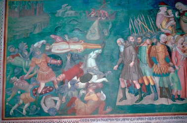 Fresco of the Israelites Crossing the Red Sea, 14th century The Crucifixion (detail) Crossing the Red Sea (detail) Frescoes (Detail) King Christian and Bartolomeo Colleoni on Horseback The Massacre of the Servants and Herdsmen of Job Central Aisle, First South Span, Christ nailed to the Cross, The Pordenone Massacre of the Innocents, Fresco in church of Santi Agostino, Siena St. Ephysius Condemned Ulysses and Ajax competing for the armor of Achilles before the courts, Ulysses Hall (detail) Triumph of Death (fresco) View of the Detail of a Fresco Depicting the Ascent to Calvary: On the Left Jesus in Front of Pontius Pilate Trionfo della Morte Battle of Zama The Conversion of Saul Scenes from the Life of Christ, c.1492 Road to Calvary (detail) The Massacre of the Innocents (Detail). Fresco of the School of Siena. 1363-1366. Monastery of Saint Benedetto, Subiaco, Italy Month of November (detail) Apse, Antonio Campi, Meeting of Jesus with the centurion Cornelio 1582-84 Noah Leading the Animals into the Ark, 1356-67 Campaign of Emperor Charles V against the Turks at Tunis in 1535: the Capture of Goletta (detail of a foot soldier holding a disembodied head) St Anthony facing the tyrant Ezzelino in Verona The Triumph of Death The Triumph of Death Martyrdom and Decollation of Empress Faustina Saint George Liberates the Libyan Princess