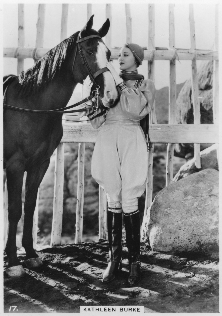 animal · standing · female · women · woman · people · animals · horses · horse · beauty · footwear · fashion · arts · country · entertainment · fence · costume · clothes · film · beautiful · boot · boots · hollywood · dress · cinema · location · century · movie · clothing · thirties · lady · concept · acting · performing arts · actor · moving picture · monochrome · collectible · sex symbol · actress · movie star · pin-up · united states of america · united states · cinematography · jodhpurs · thespian · black white · black and white · 1930s · 20th century · riding boot · american · america · cigarette card · film star · photograph · portrait · unknown · burke · kathleen · kathleen burke · The Print Collector/Heritage Images |