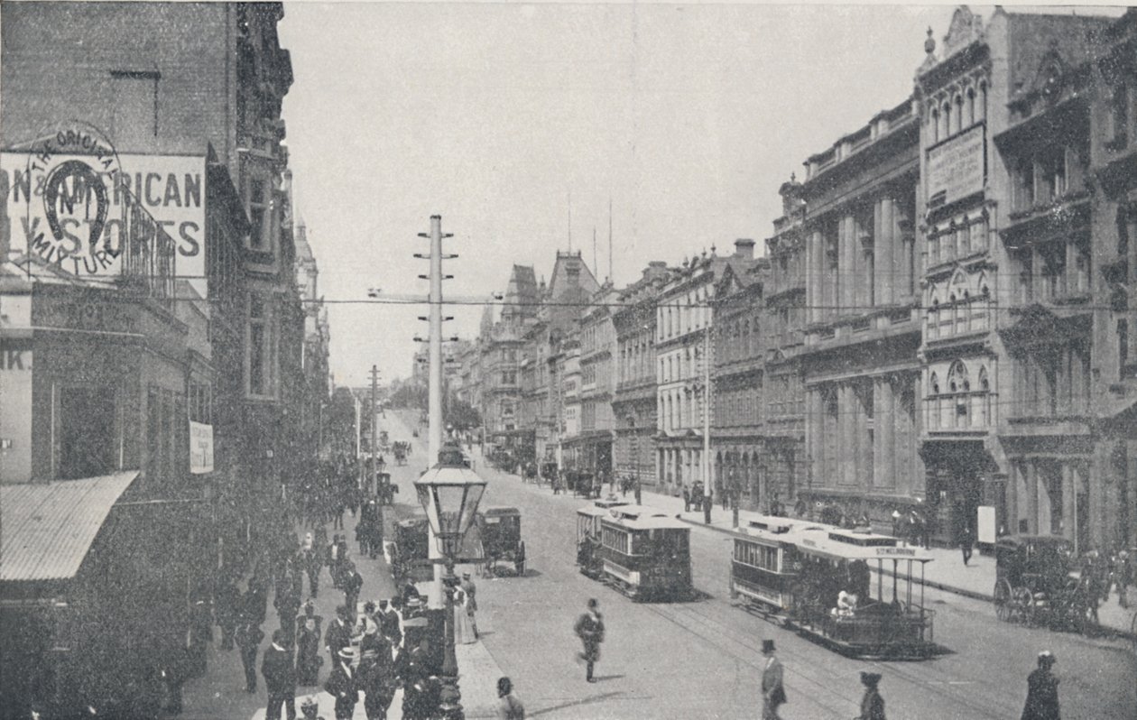 transport · transportation · exterior · outdoors · city · urban · road · female · women · woman · people · male · busy · shopping · shop · shops · arts · australia · australian · country · sign · pedestrian · book · lane · avenue · tram · victoria · perspective · shop front · location · century · public transport · literature · lady · concept · melbourne · twenties · monochrome · streetcar · road transport · black white · black and white · 1920s · 20th century · outside · street · photograph · unknown · barnard · black · adam charles black · ac black · h clive barnard · australia new zealand and oceania in picture · h clive · adam charles · The Print Collector/Heritage Images |