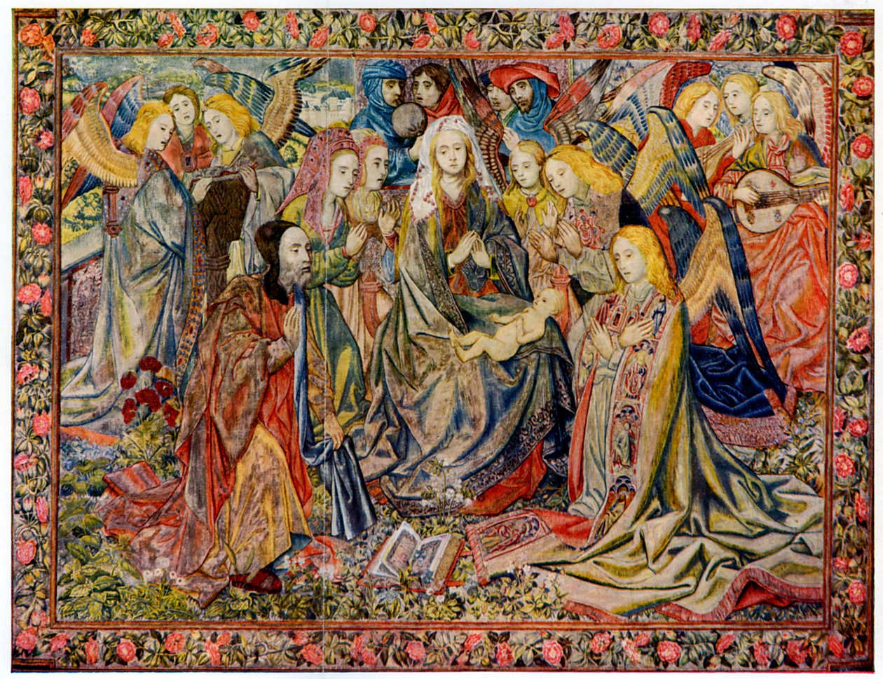 people · child · children · music · religious · arts · infant · baby · babies · playing · religion · british · color · colour · christianity · infancy · prayer · praying · angel · textiles · musical instrument · britain · tapestry · textile · concept · surrounded · hands clasped · adoration · stringed instrument · lute · virgin and child · unknown · thomson · wg thomson · wg thomas · thomas · The Print Collector/Heritage Images