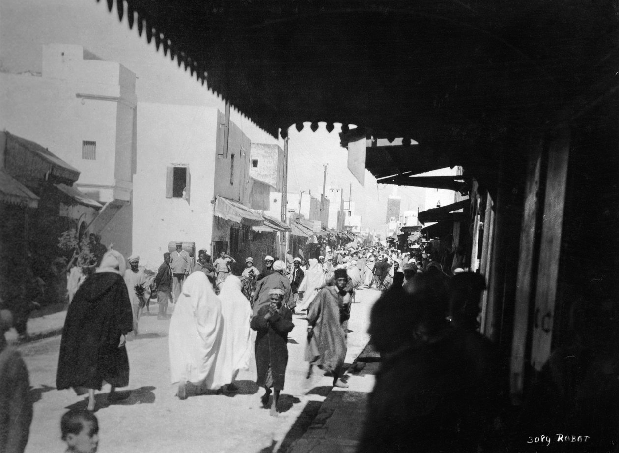 exterior · city · morocco · africa · moroccan · road · building · buildings · people · busy · walking · street · country · pedestrian · awning · continent · shade · african · lane · avenue · location · century · blind · thirties · concept · outside · north african · twenties · north africa · monochrome · rambling · rabat · black white · black and white · 1930s · 1920s · 20th century · sun blind · photograph · unknown · The Print Collector/Heritage Images |