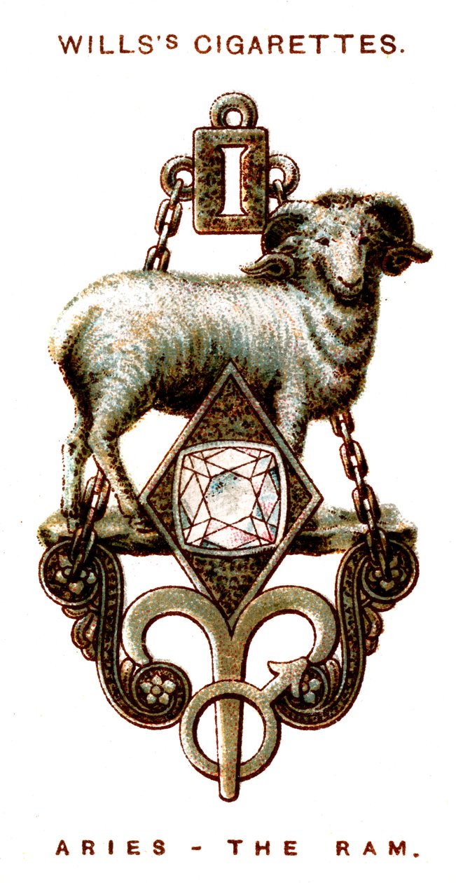 animal · sign · symbol · science · belief · sheep · color · colour · luck · lucky · superstition · astrology · jewellery · jewelry · century · charm · jewel · concept · mythology · zodiac · mythological · twenties · collectible · lucky charm · pendant · 1920s · 20th century · aries · cigarette card · star sign · unknown · wd ho wills · wills · wd ho · The Print Collector/Heritage Images |