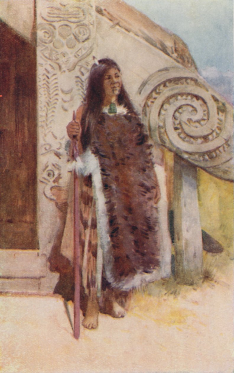 exterior · outdoors · standing · female · women · woman · people · arts · country · local · book · costume · clothes · color · brown · new zealand · decorative · dress · cabin · hair · traditional costume · native · location · face paint · century · long hair · barefoot · clothing · literature · lady · twenties · one person · maori · cloak · colour · 1920s · 20th century · chieftain · new zealander · traditional dress · outside · aotearoa · aotearoan · indigenous · portrait · unknown · barnard · tradition dress · black · adam charles black · ac black · h clive barnard · australia new zealand and oceania in picture · h clive · adam charles · The Print Collector/Heritage Images |