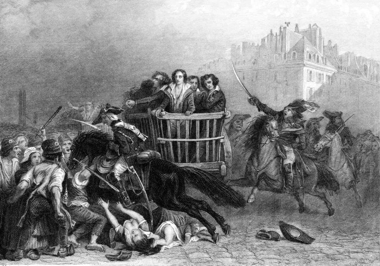 people · country · french · france · fear · anger · death · location · century · rebellion · victim · revolution · concept · rage · fury · terror · monochrome · execution · condemned · guillotine · black white · black and white · 18th century · eighteenth century · revolutionary · ann ronan pictures · french revolution 1789-1799 · tumbril · engraving · unknown · Ann Ronan Picture Library/Heritage-Images