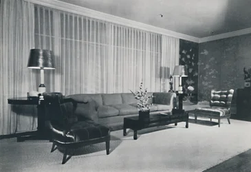 building · buildings · interior · indoors · house · style · industry · room · design · table · seat · century · inside · sofa · settee · sitting room · living room · decor · interior design · drawing room · furniture · company · 1940s · retro · coffee table · monochrome · interior decoration · forties · living-room · black white · black and white · 20th century · decade · drawing-room · sitting-room · photograph · unknown · geoffrey · constance · holme · geoffrey holme · c g holme · c. g. holme · c.g. holme · c. g. · c.g. · lord taylor · constance spry · spry · The Print Collector/Heritage Images