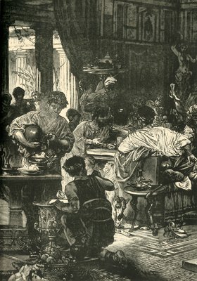 italy · food · drink · people · male · interior · arts · relaxation · country · rome · relaxing · book · occupation · alcohol · abundance · wine · ancient · roman · location · century · conversation · profession · inside · literature · concept · plenty · couch · conversing · banquet · feast · slavery · servant · monochrome · slave · 19th century · indoors · black white · black and white · ancient rome · nineteenth century · servants · history · historic · feasting · illustration · engraving · unknown · cassells · edmund · cassell co · edmund ollier · ollier · cassell and company ltd · cassell company · cassell · cassells illustrated universal history · The Print Collector/Heritage Images