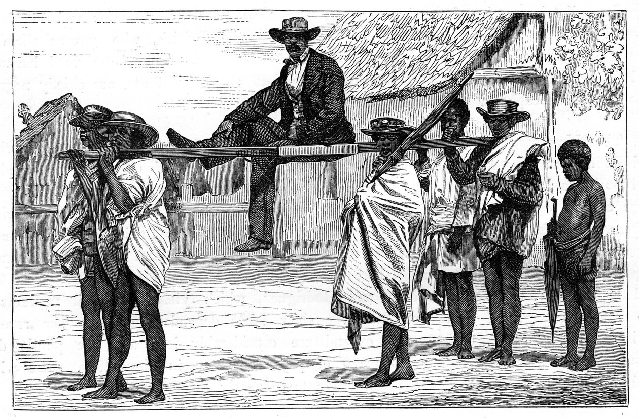 travel · africa · carrying · people · black · male · country · costume · continent · clothes · african · madagascar · litter · dress · passengers · passenger · travelling · traditional costume · location · century · madagascan · monochrome · 19th century · black white · black and white · national costume · nineteenth century · national dress · traditional dress · malagasy · engraving · unknown · robert · brown · robert brown · The Print Collector/Heritage Images