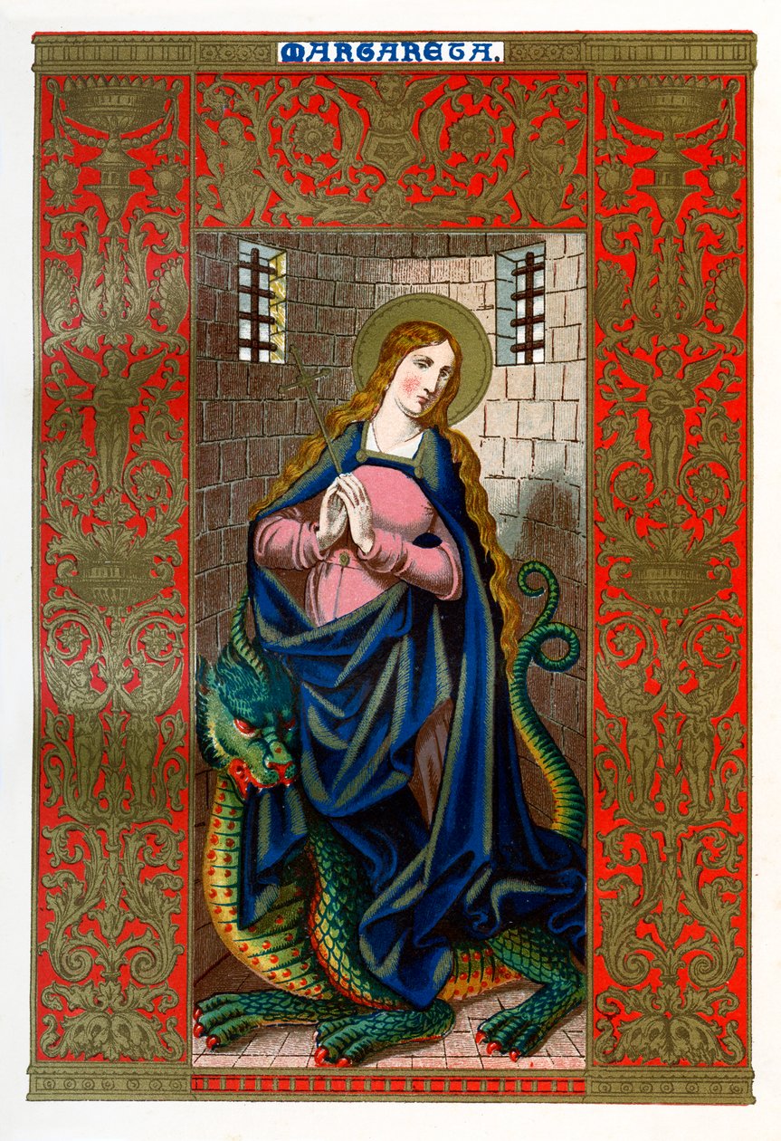 female · women · woman · people · religious · tower · religion · symbol · virgin · crime · color · colour · captive · christian · christianity · saint · dragon · captivity · century · imprisonment · imprisoned · lady · concept · halo · mythology · devil · 19th century · mythical creature · martyr · nineteenth century · 4th century · martyrdom · mythical beast · margaret · st margaret · portrait · unknown · alban · saint margaret · margaret of antioch · st marina · saint marina · alban butler · butler · The Print Collector/Heritage Images
