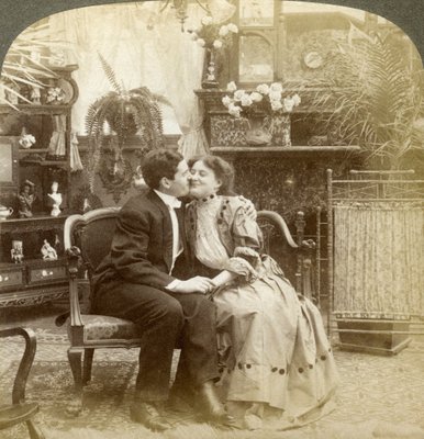female · women · woman · people · male · love · romance · couple · fashion · sitting · happiness · embracing · happy · marriage · romantic · kissing · room · togetherness · cuddling · dress · chair · century · agreement · kiss · together · proposal · living room · furniture · embrace · lady · concept · lover · monochrome · living-room · 19th century · black white · black and white · 1900s · 20th century · nineteenth century · drawing-room · sitting-room · stereoscopic · stereoscopic photography · photograph · stereoscopic card · underwood underwood · The Print Collector/Heritage Images