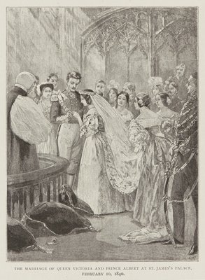 19th century · albert prince consort (1819-1861) · united kingdom · europe · royalty · england · priest · church · history · queen victoria of the united kingdom (1819-1901) · queen · standing · bride · wedding · 20th century · large group of people · time period · 19th century style · uniform · place of worship · group of people · palace · magazine · wedding ceremony · 1840s · bridal train · wedding ring · bridegroom · styles · journal · physical stance · printed media · military uniform · vertical · 19th century · wedding · indoors · personal adornment · publication · victorian · bridesmaid · clothing · periodical · royal person · black and white · queen victoria · dress · headdress · bridal veil · wedding guest · finger ring · wedding dress · chapel · jewelry · veil · st james · illustration · st. james · maleman · femalewoman · occupationreligious occupation · s palace · queenwedding role · bridesmaid dress · / Bridgeman Images