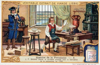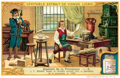 History of porcelain: Johann Friedrich Bottger (Bottcher or Bottiger) (1682-1719) finds the true method for making porcelain in 1709(History of porcelain: Johann Friedrich Bottger (Bottcher or Bottiger) (1682-1719) finds the true method for making porcelain in 1709 - Liebig chromolithography)Unknown artist |