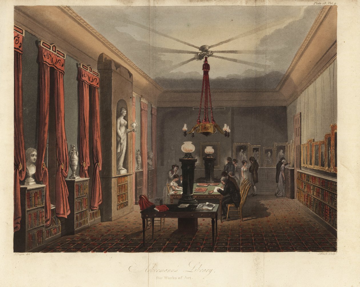 room · library · people · copperplate engraving · portfolio · prints · handcoloured · repository of arts · augustus pugin · regency · bookcase · books · the strand · painting · bookseller · gas light · illustration · rudolph ackermann · ackermanns library for works of art · j. bluck · publsher · f.c. accum · - / Bridgeman Images