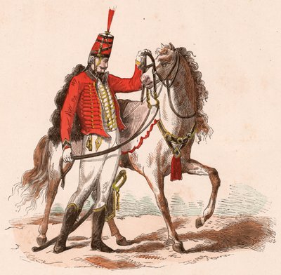 A French Hussar in His Uniform Standing Next to His Horse(A French hussar in his uniform standing next to his horse (colour engraving))Unknown |