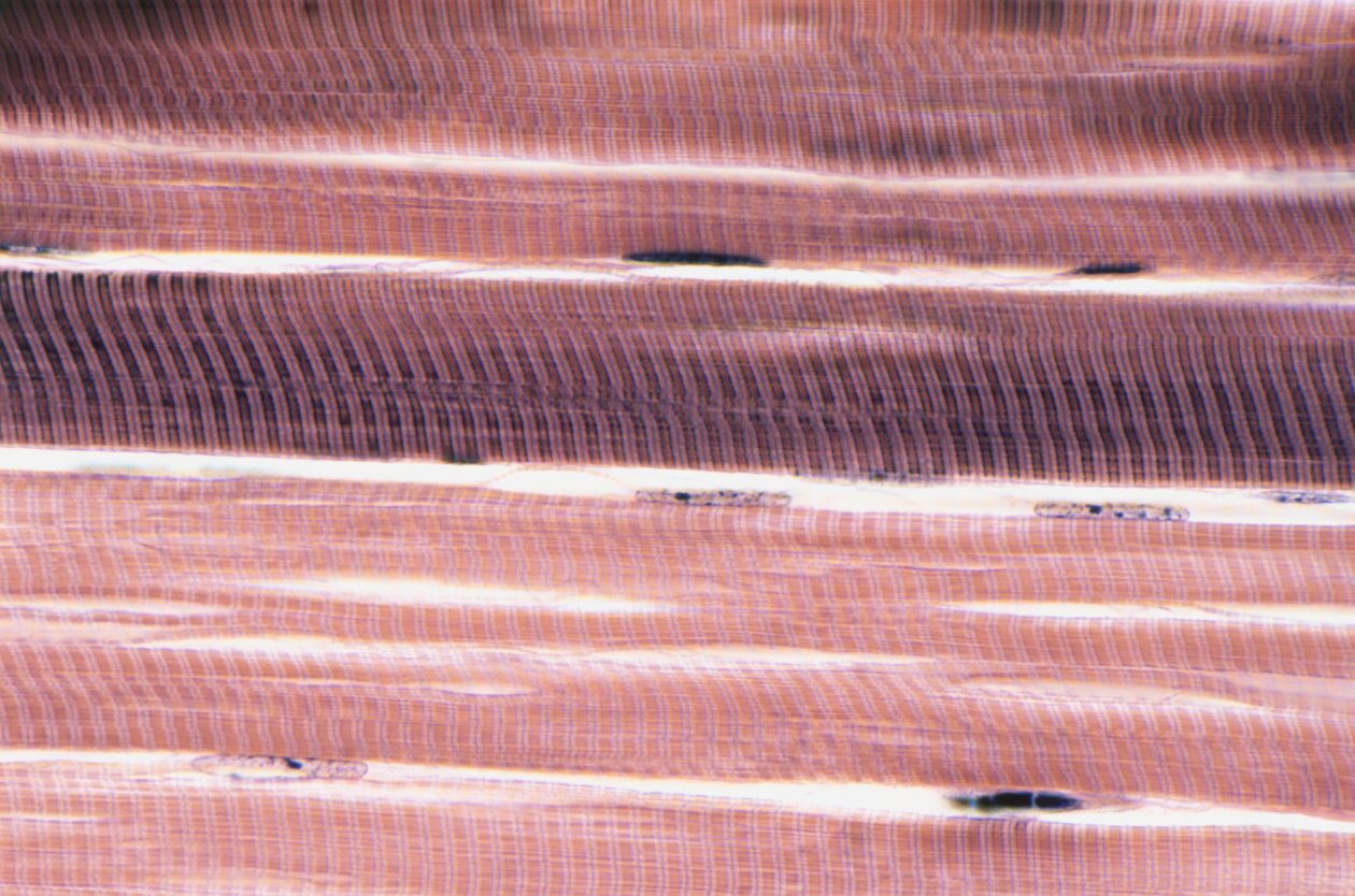 anatomy · high-scale magnification · human muscle · backgrounds · physiology · human cell · full frame · skeletal muscle · no people · light micrograph · horizontal · - / Bridgeman Images |