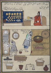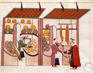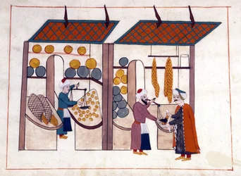 A fruit and vegetable merchant (four seasons) in Constantinople, Turkey under the Ottoman Empire. Miniature from 'Turkish Memorials' (codex Cicogna 1971 'Memorie Turchesche')(A fruit and vegetable merchant (four seasons) in Constantinople, Turkey under the Ottoman Empire. Miniature from “” Turkish Memorials”” (codex Cicogna 1971 “Memorie Turchesche”) Watercolour from the 17th century Venetian school.)Venetian School |