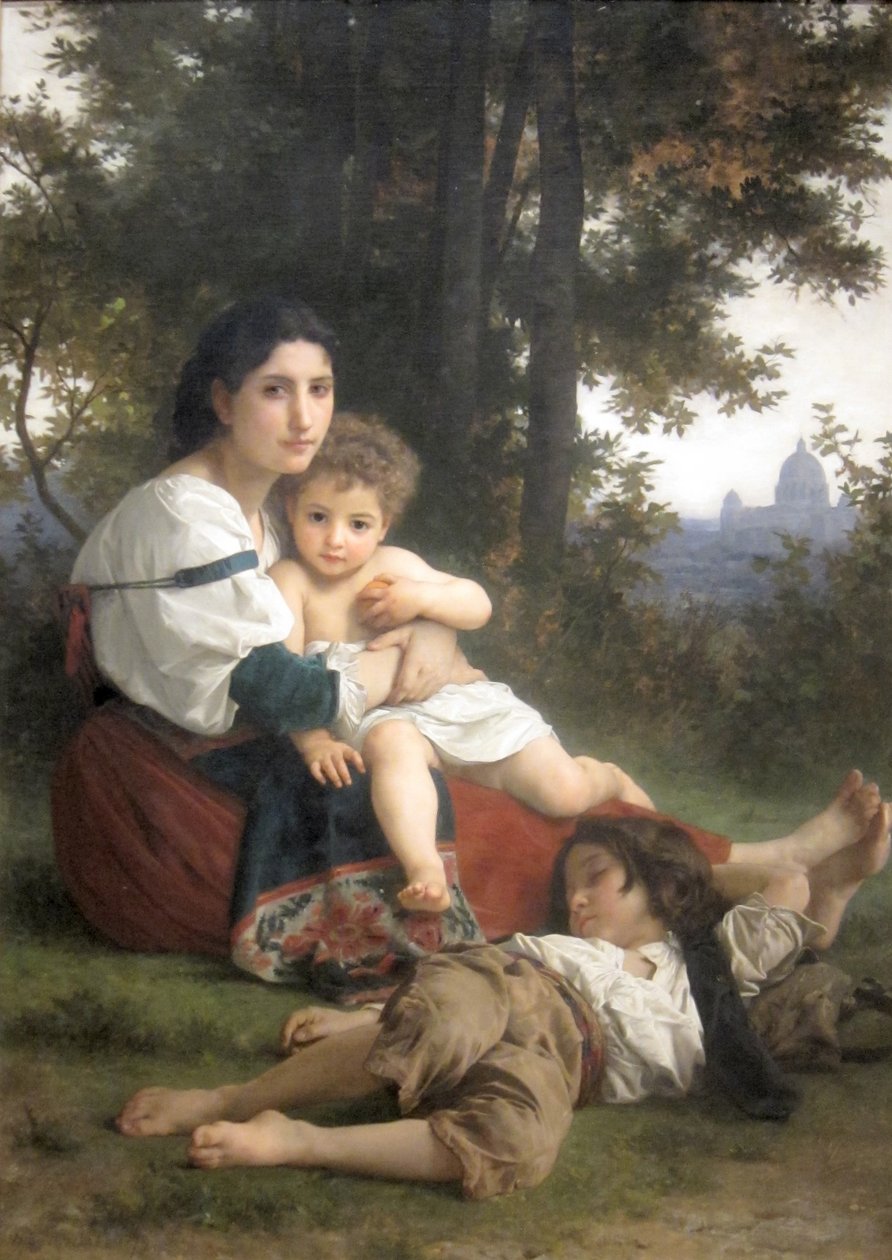 sleeping · trees · children · mother · outside · red clothing · depressed · worried · lonely