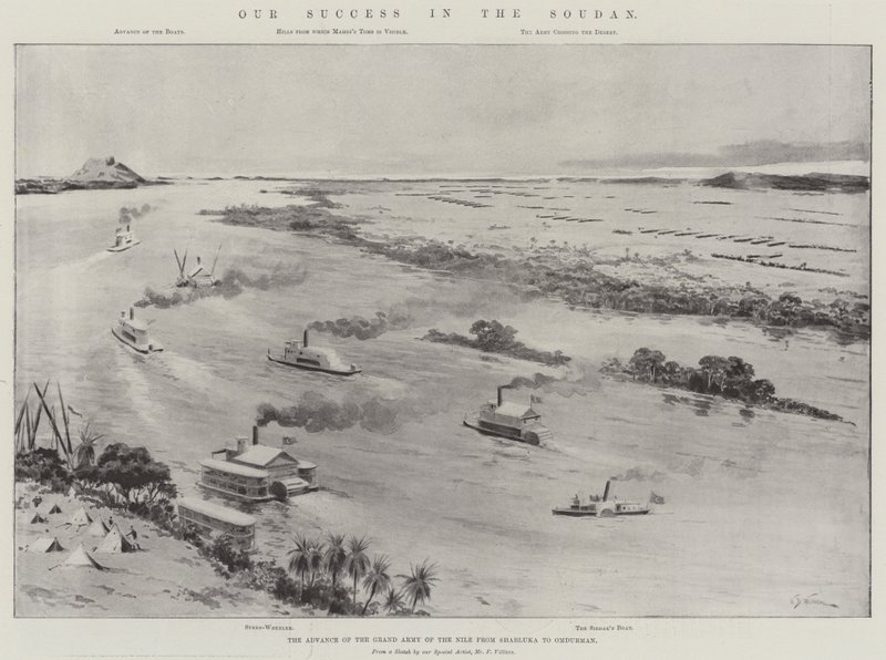 success · soudan · advance · grand army · nile · shabluka · omdurman · boats · hills · mahdis tomb · visible · army · crossing · desert · stern wheeler · sirdars boat · river nile · sudan · mahdist war · Private Collection / Bridgeman Images · / Look and Learn |