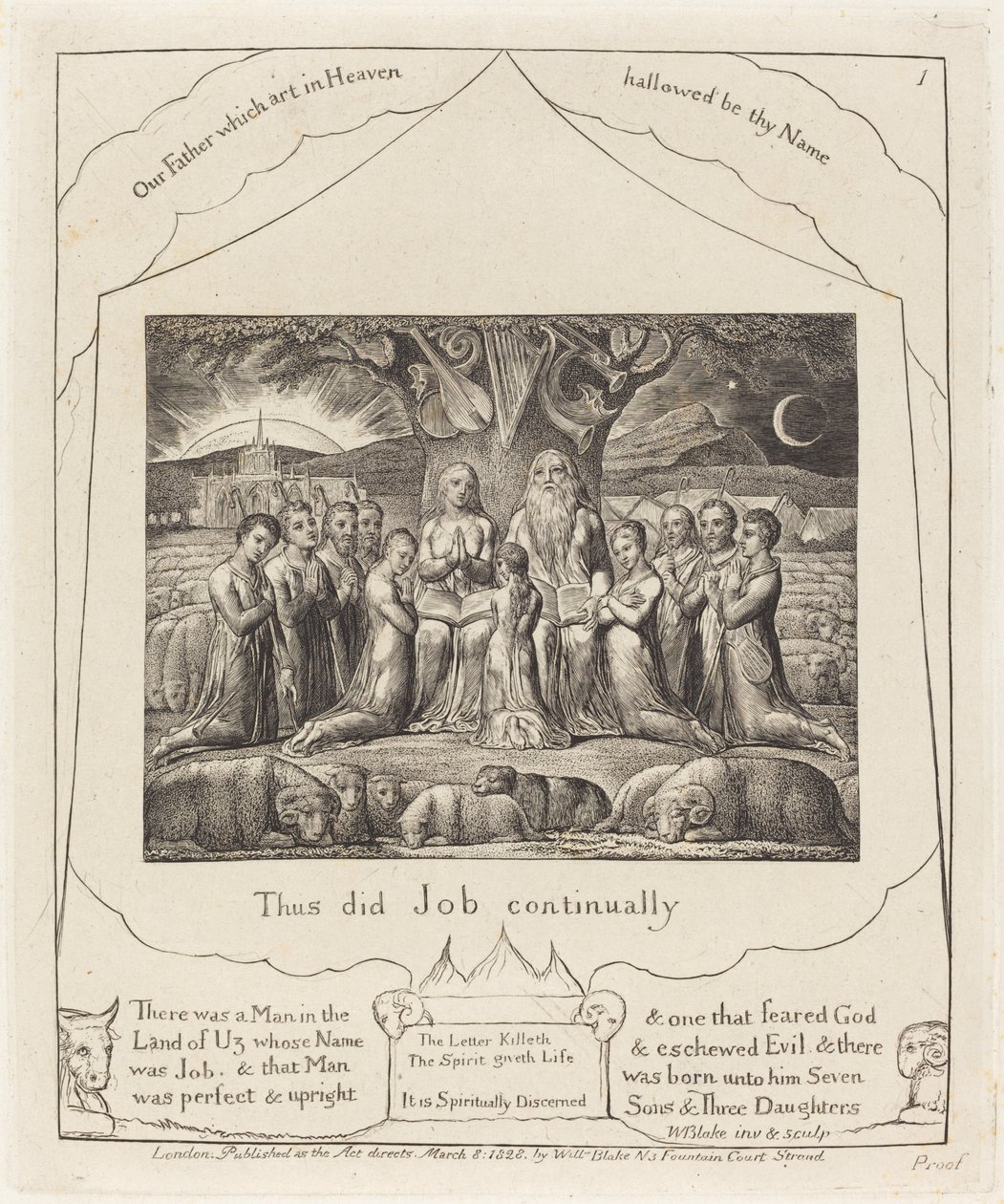 nature · animal · tree · england · people · child · children · family · religious · plant · plants · arts · country · religion · sheep · british · english · christianity · judaism · jewish · prayer · praying · kneeling · location · century · britain · biblical · old testament · 19th century · black white · black and white · nineteenth century · book of job · trees · bible scene · william blake · blake · william · heritage art · print · engraving on india paper · Heritage Art/Heritage Images