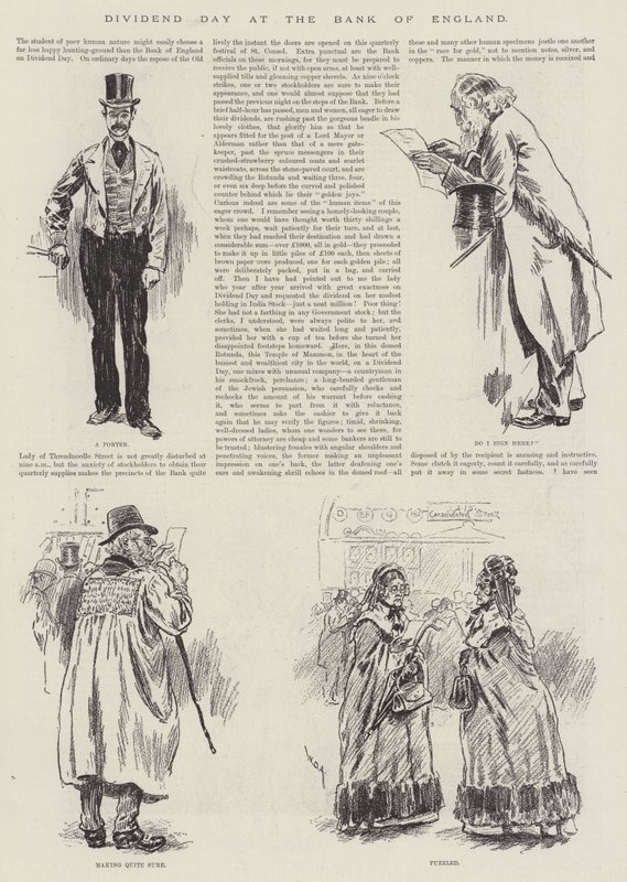 dividend day · bank of england · porter · sign · puzzled · city of london · Private Collection / Bridgeman Images · / Look and Learn |