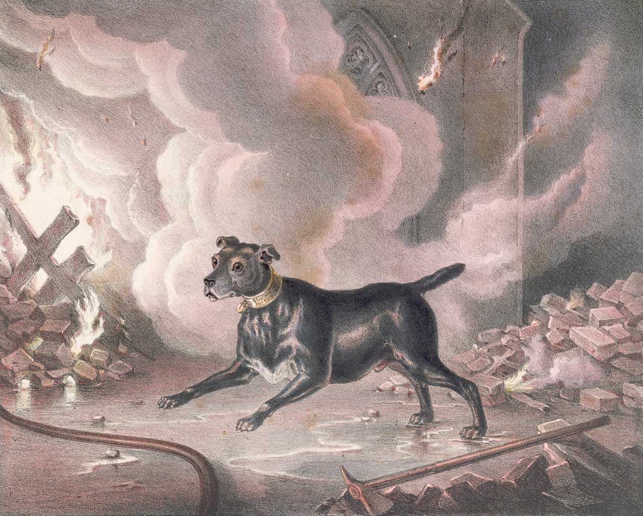 fireman · rescue · chance · burning · church · rubble · help · emergency · smoke · searching for life · brigade · fire · brave · dogs · Private Collection / Bridgeman Images |
