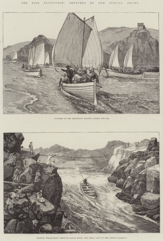 nile expedition · pioneers · expedition · leaving · sarras · hauling · whale boats · kebir · great gate · second cataract · sudan · River Nile · Military · Boats · Private Collection / Bridgeman Images · / Look and Learn |