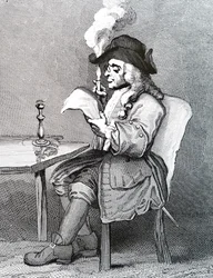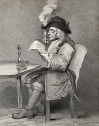 male · full length · seated · profile · caricature · candle · hat on fire · absent-minded · reading · engrossed · unaware · georgian · humour · humorous · satire · satirical · accident · Private Collection / Bridgeman Images