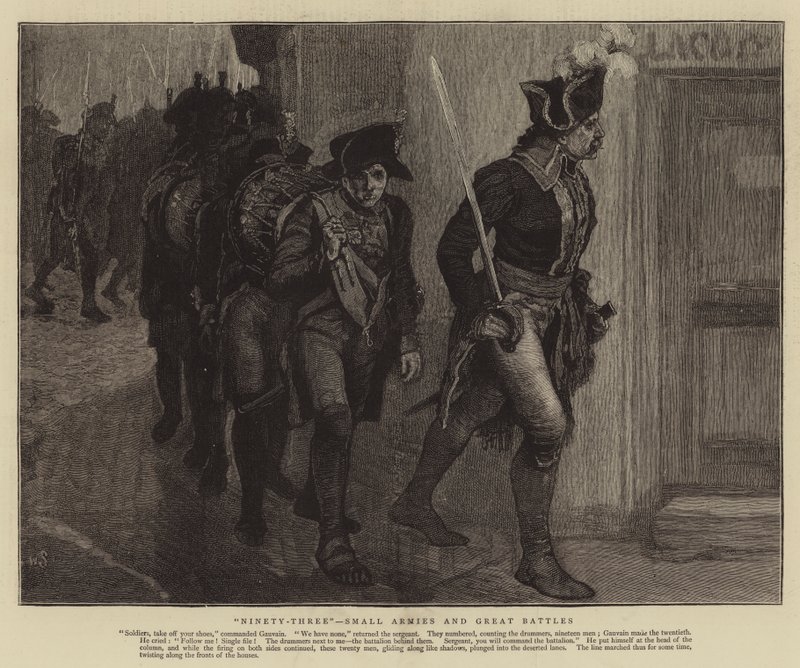 ninety three · small armies · great battles · soldiers · shoes · gauvain · sergeant · drummers · battalion · houses · military · french revolution · victor hugo · Literary Illustrations · Private Collection / Bridgeman Images · / Look and Learn |