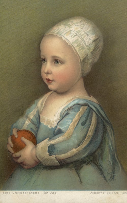 postcard · postcards · son of charles i · anthony van dyck · baby · babies · child · children · portrait · portraits · king charles i · lace · blue · apple · apples · robe · royal · royals · royalty · england · english · britain · british · prince · princes · stuart · Stuarts · Private Collection / Bridgeman Images · / Look and Learn |