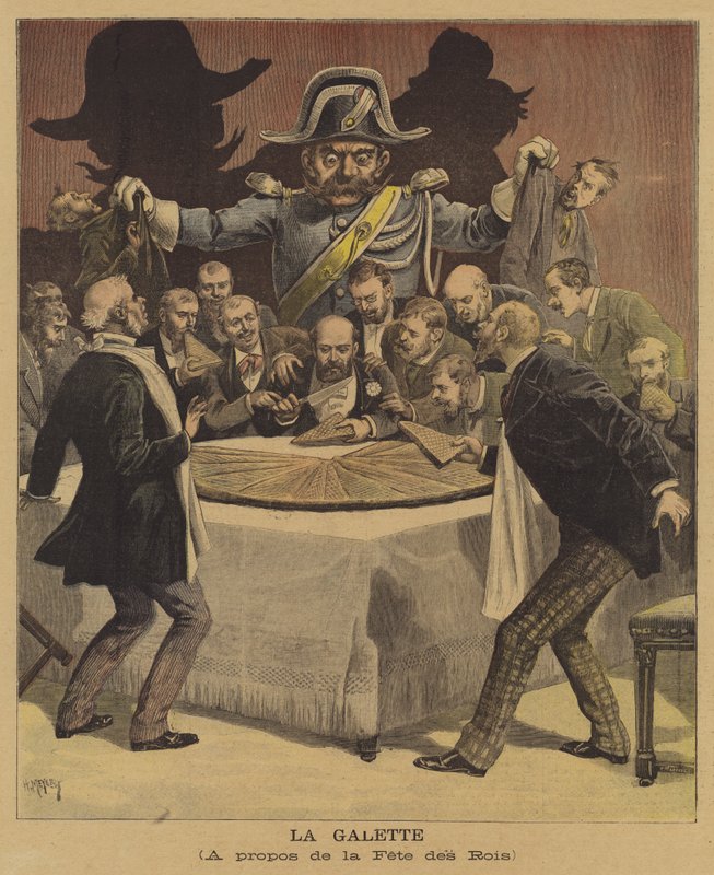 wafer · french · greed · gluttony · greedy · dividing · slices · eating · food · fete des rois · epiphany · twelth night · tradition · satire · satirical · caricature · crime · corruption · 19th century · france · money · finance · scandal · bankers · police · arresting · Private Collection / Bridgeman Images · / Look and Learn